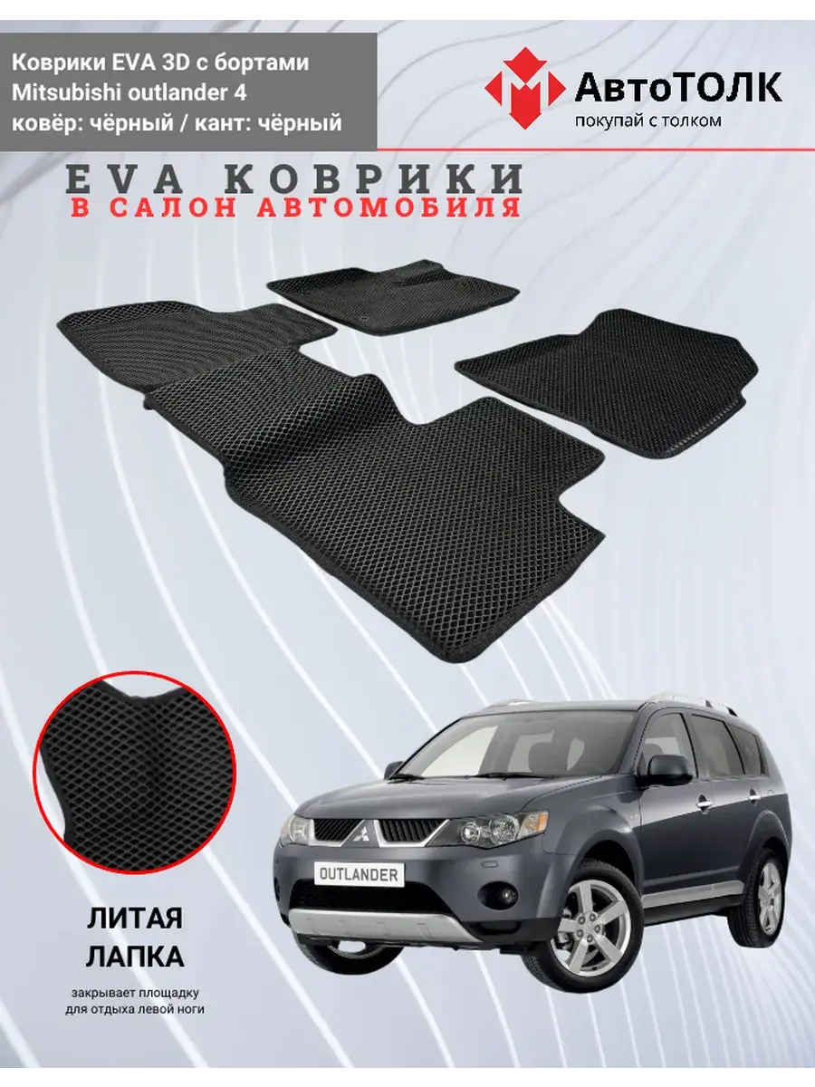 Автомобильные коврики ЕВА (EVA) 3D с бортами для Mitsubishi outlander 4. Устали от грязи под ногами в вашем автомобиле и постоянных поездок на автомойку? Замените штатные резиновые коврики высокотехнологичными EVA коврами с бортами с традиционной фактурой ромб. В комплект ЭВО ковриков входит: водительский, пассажирский, 2 коврика заднего ряда и перемычка на тоннель.