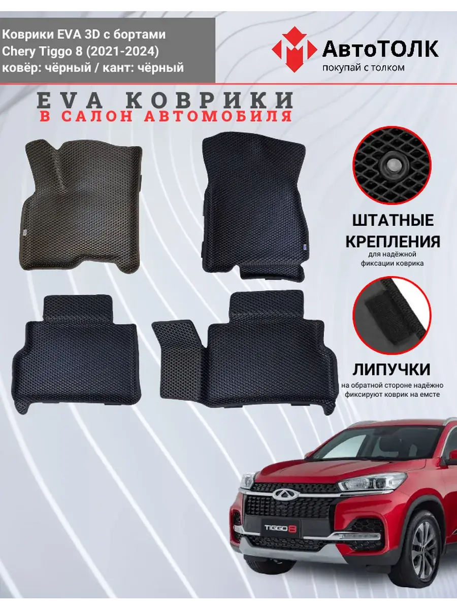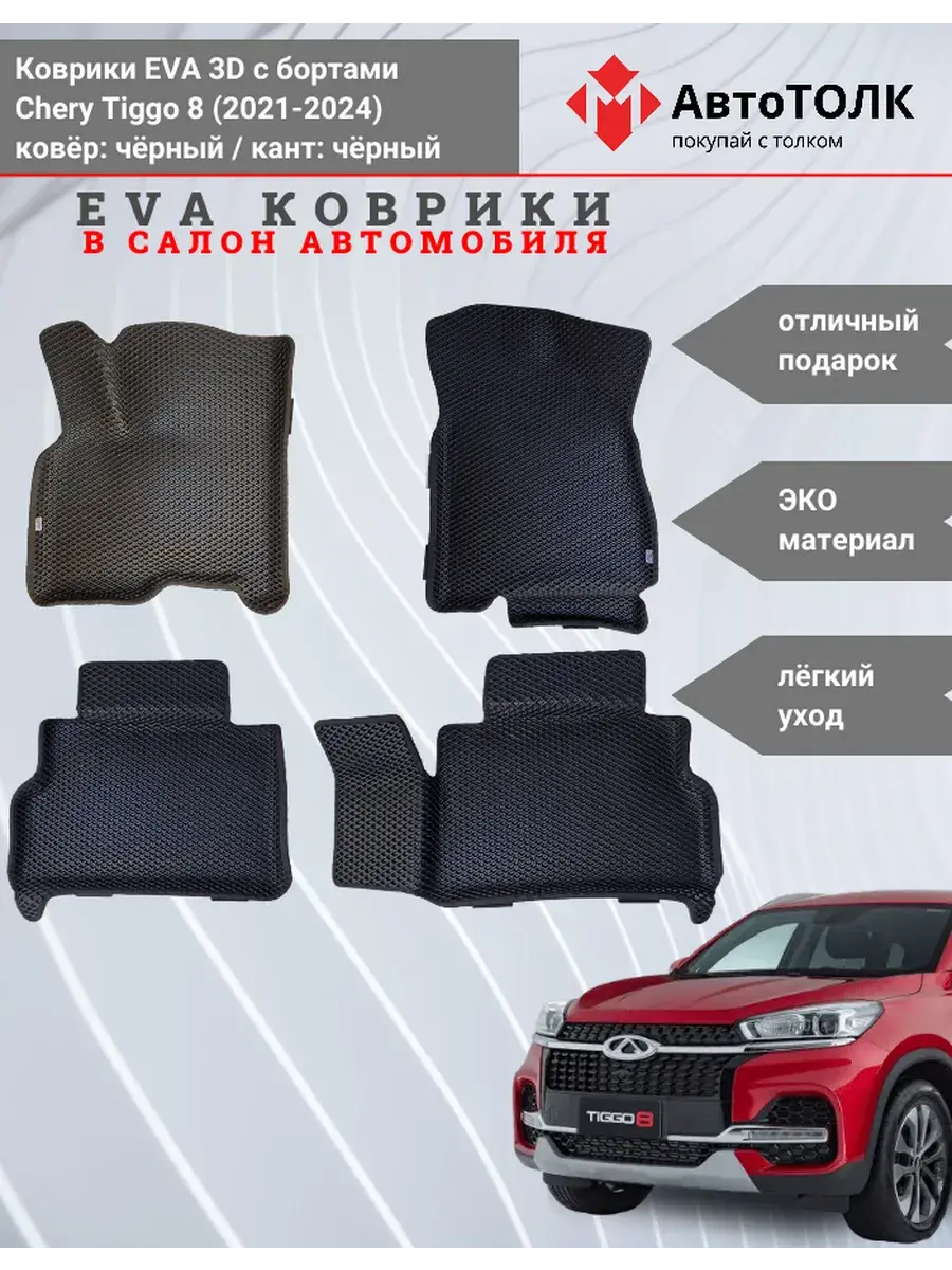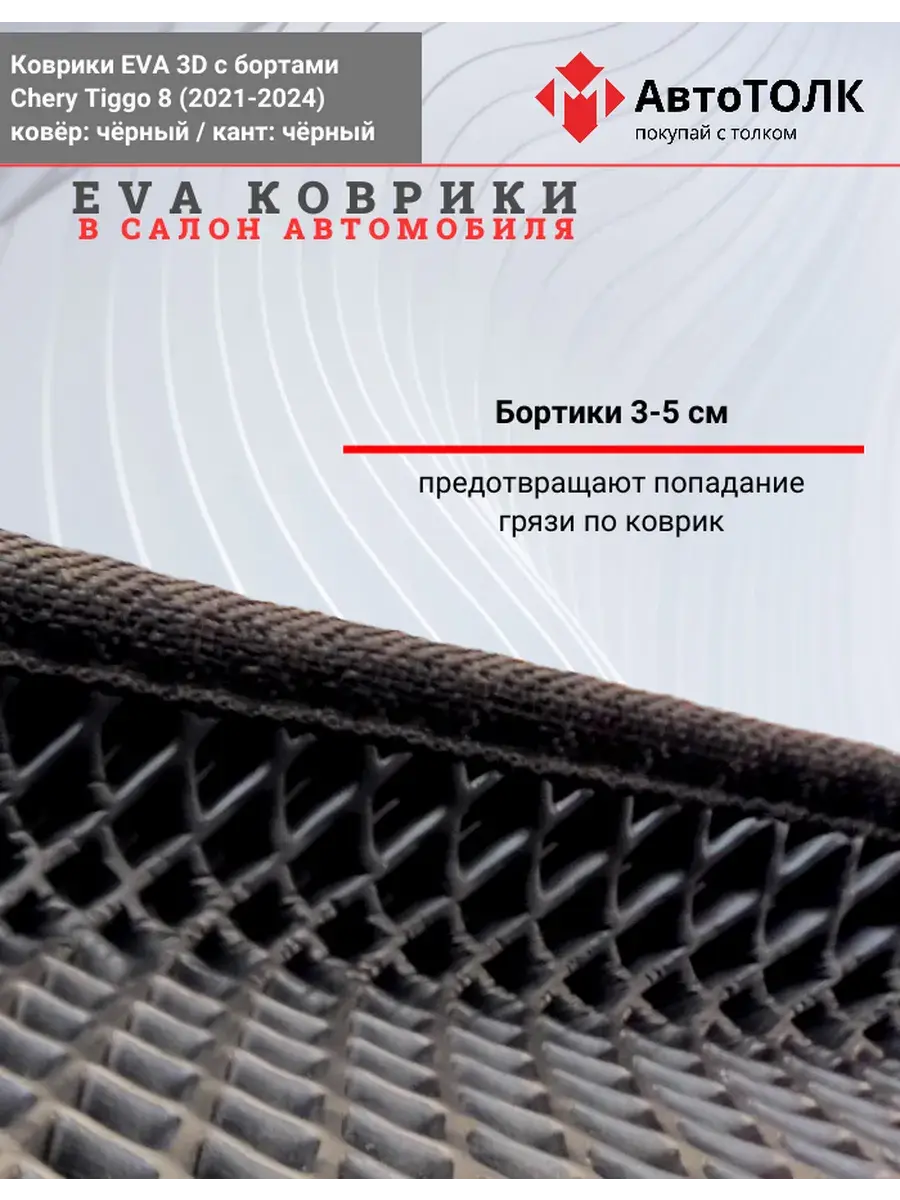 Автомобильные коврики ЕВА (EVA) 3D с бортами для Chery Tiggo 8. Устали от грязи под ногами в вашем автомобиле и постоянных поездок на автомойку? Замените штатные резиновые коврики высокотехнологичными EVA коврами с бортами с традиционной фактурой ромб. В комплект ЭВО ковриков входит: водительский, пассажирский, 2 коврика заднего ряда и перемычка на тоннель.