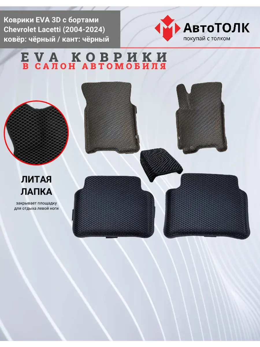 Автомобильные коврики ЕВА (EVA) 3D с бортами для Chevrolet Lacetti. Устали от грязи под ногами в вашем автомобиле и постоянных поездок на автомойку? Замените штатные резиновые коврики высокотехнологичными EVA коврами с бортами с традиционной фактурой ромб. В комплект ЭВО ковриков входит: водительский, пассажирский, 2 коврика заднего ряда и перемычка на тоннель.