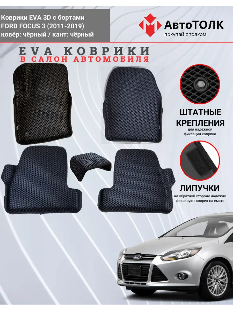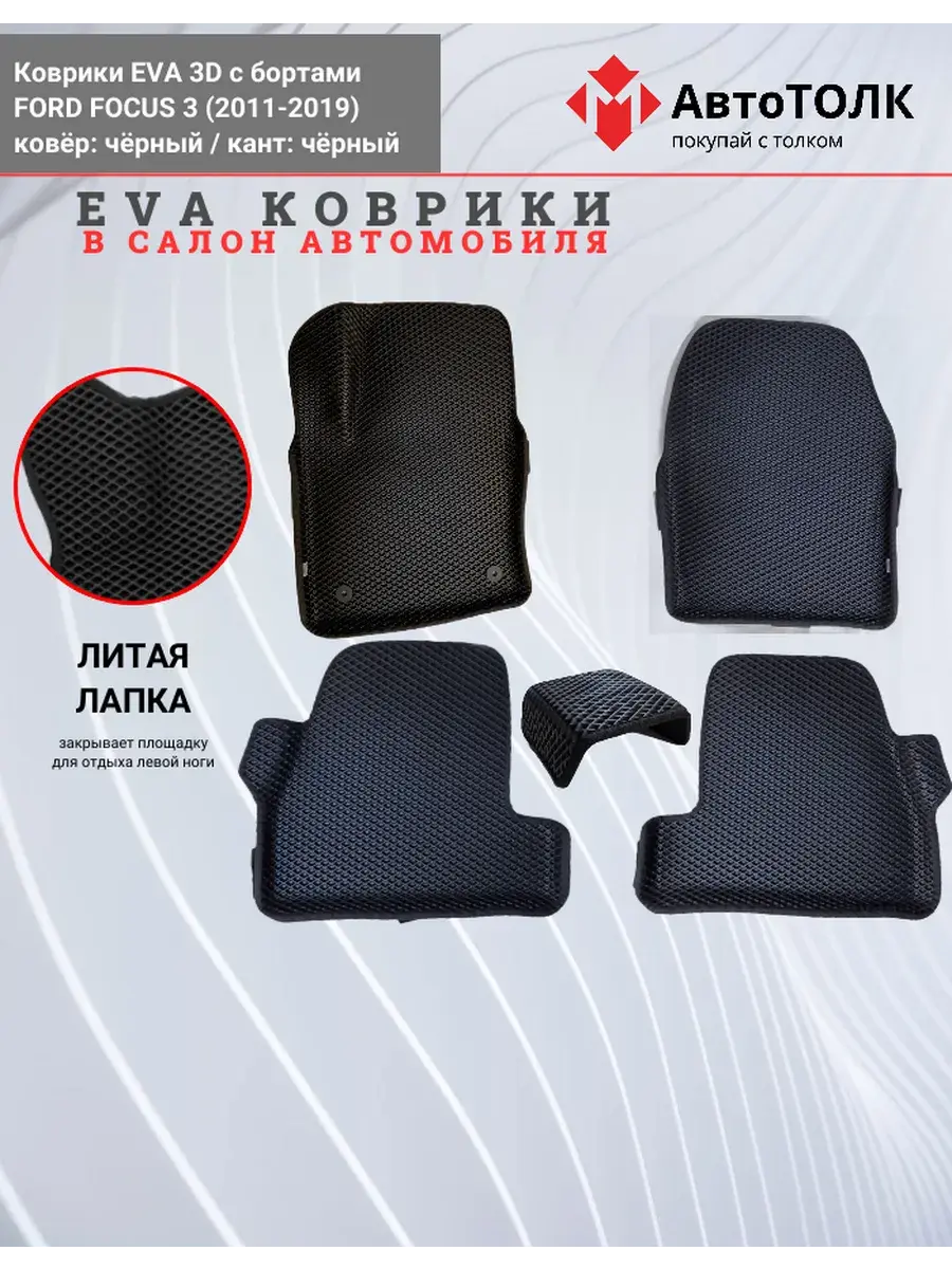 Автомобильные коврики ЕВА (EVA) 3D с бортами для FORD FOCUS 3. Устали от грязи под ногами в вашем автомобиле и постоянных поездок на автомойку? Замените штатные резиновые коврики высокотехнологичными EVA коврами с бортами с традиционной фактурой ромб. В комплект ЭВО ковриков входит: водительский, пассажирский, 2 коврика заднего ряда и перемычка на тоннель.