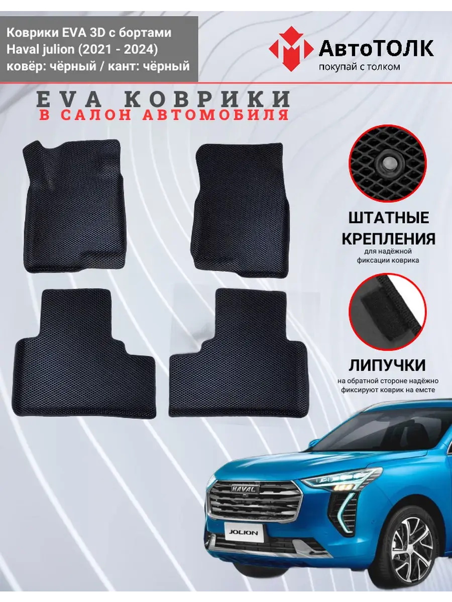 Автомобильные коврики ЕВА (EVA) 3D с бортами для Haval Julion. Устали от грязи под ногами в вашем автомобиле и постоянных поездок на автомойку? Замените штатные резиновые коврики высокотехнологичными EVA коврами с бортами с традиционной фактурой ромб. В комплект ЭВО ковриков входит: водительский, пассажирский, 2 коврика заднего ряда и перемычка на тоннель.