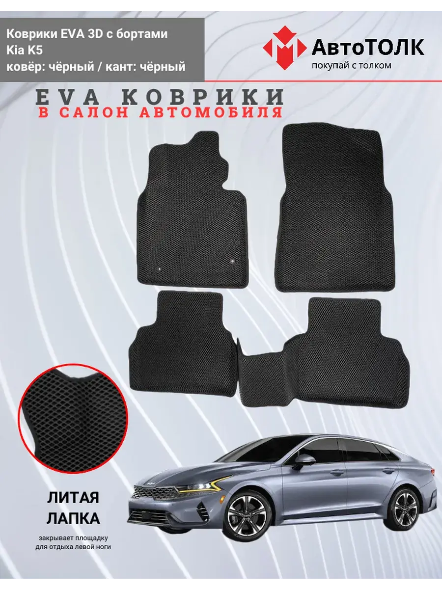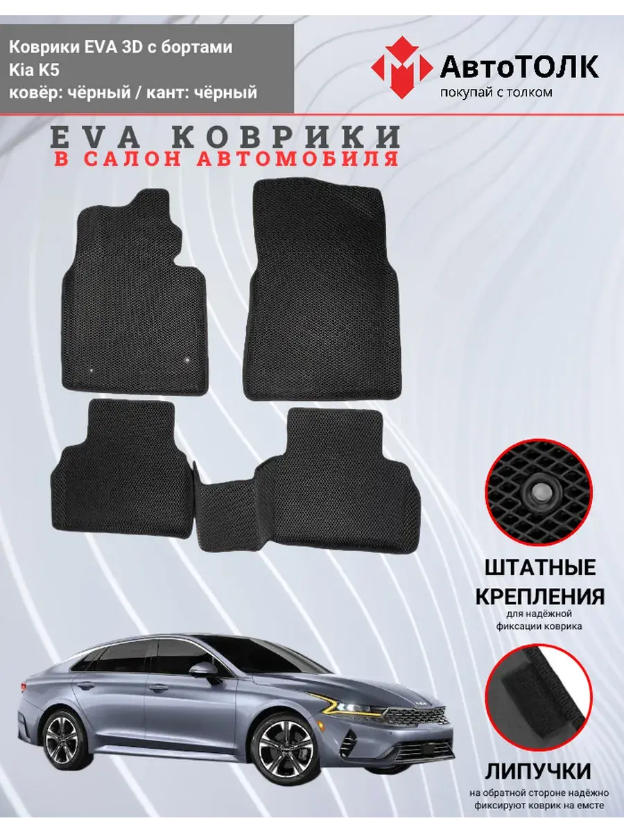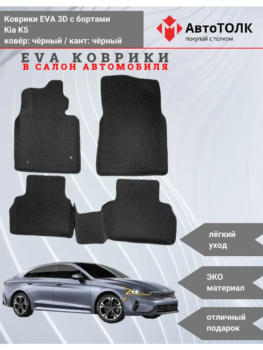 Автомобильные коврики ЕВА (EVA) 3D с бортами для KIA K5. Устали от грязи под ногами в вашем автомобиле и постоянных поездок на автомойку? Замените штатные резиновые коврики высокотехнологичными EVA коврами с бортами с традиционной фактурой ромб. В комплект ЭВО ковриков входит: водительский, пассажирский, 2 коврика заднего ряда и перемычка на тоннель.