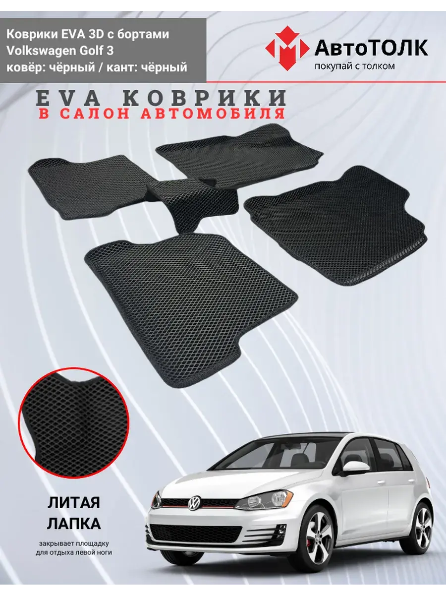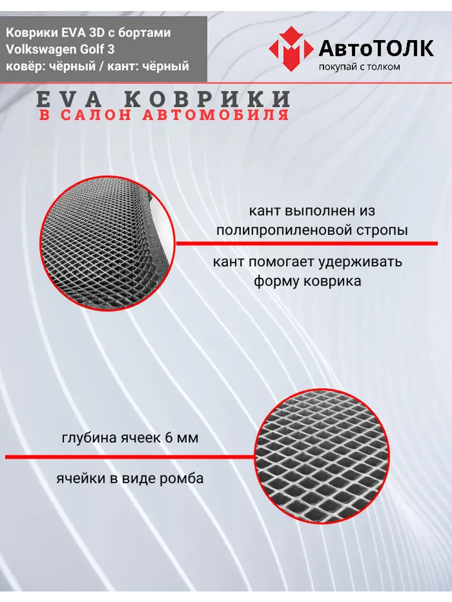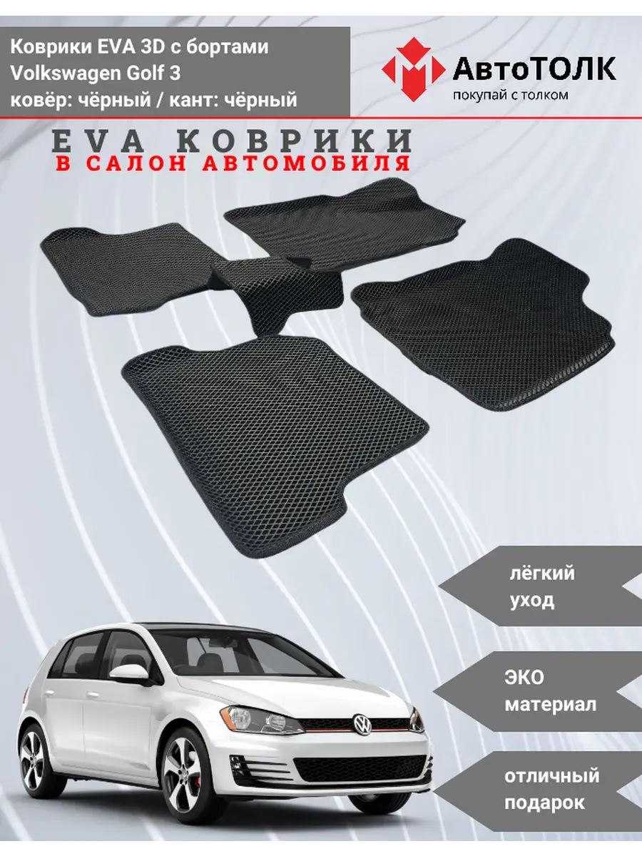 Автомобильные коврики ЕВА (EVA) 3D с бортами для Volkswagen Golf 3. Устали от грязи под ногами в вашем автомобиле и постоянных поездок на автомойку? Замените штатные резиновые коврики высокотехнологичными EVA коврами с бортами с традиционной фактурой ромб. В комплект ЭВО ковриков входит: водительский, пассажирский, 2 коврика заднего ряда и перемычка на тоннель.