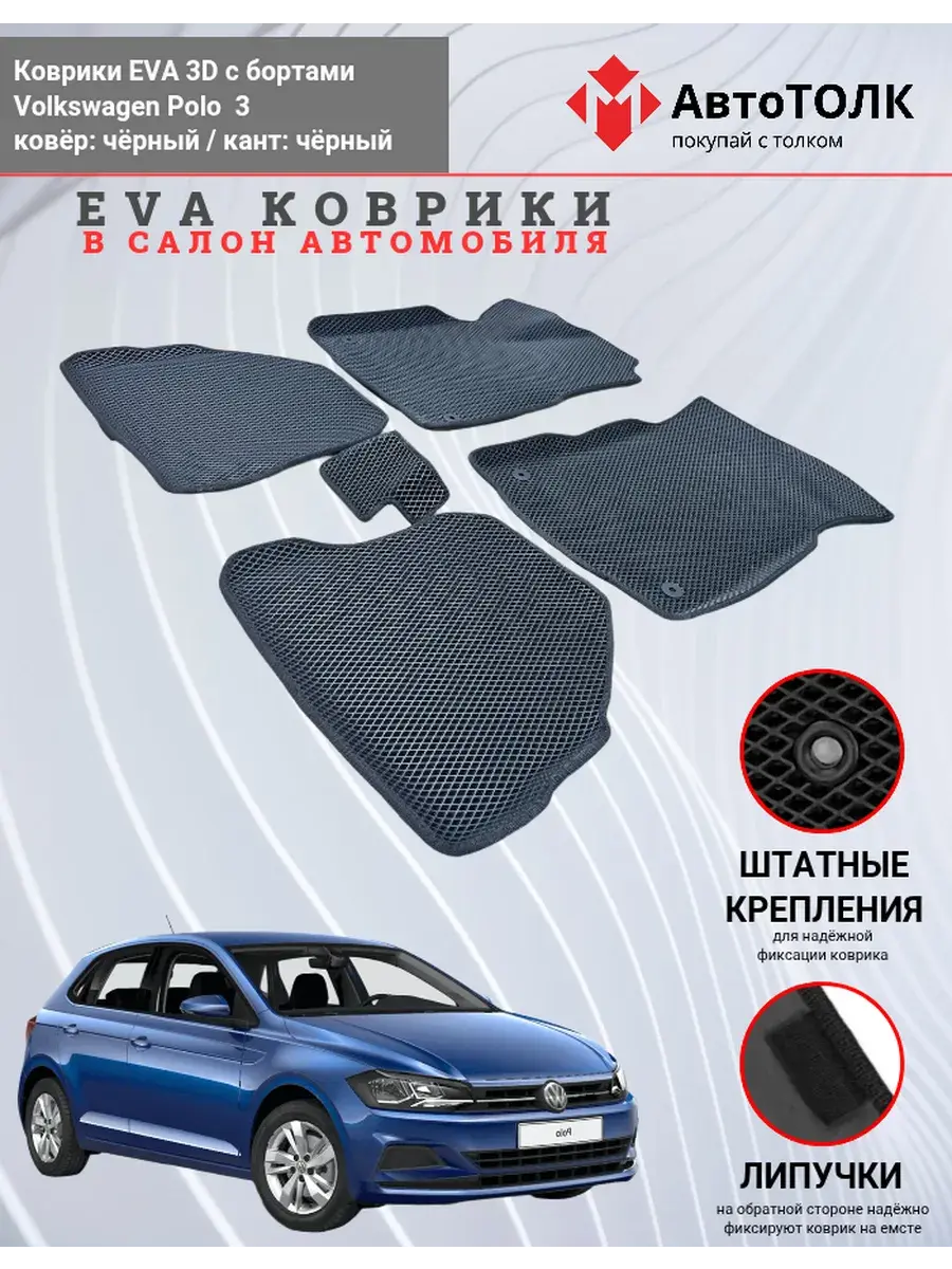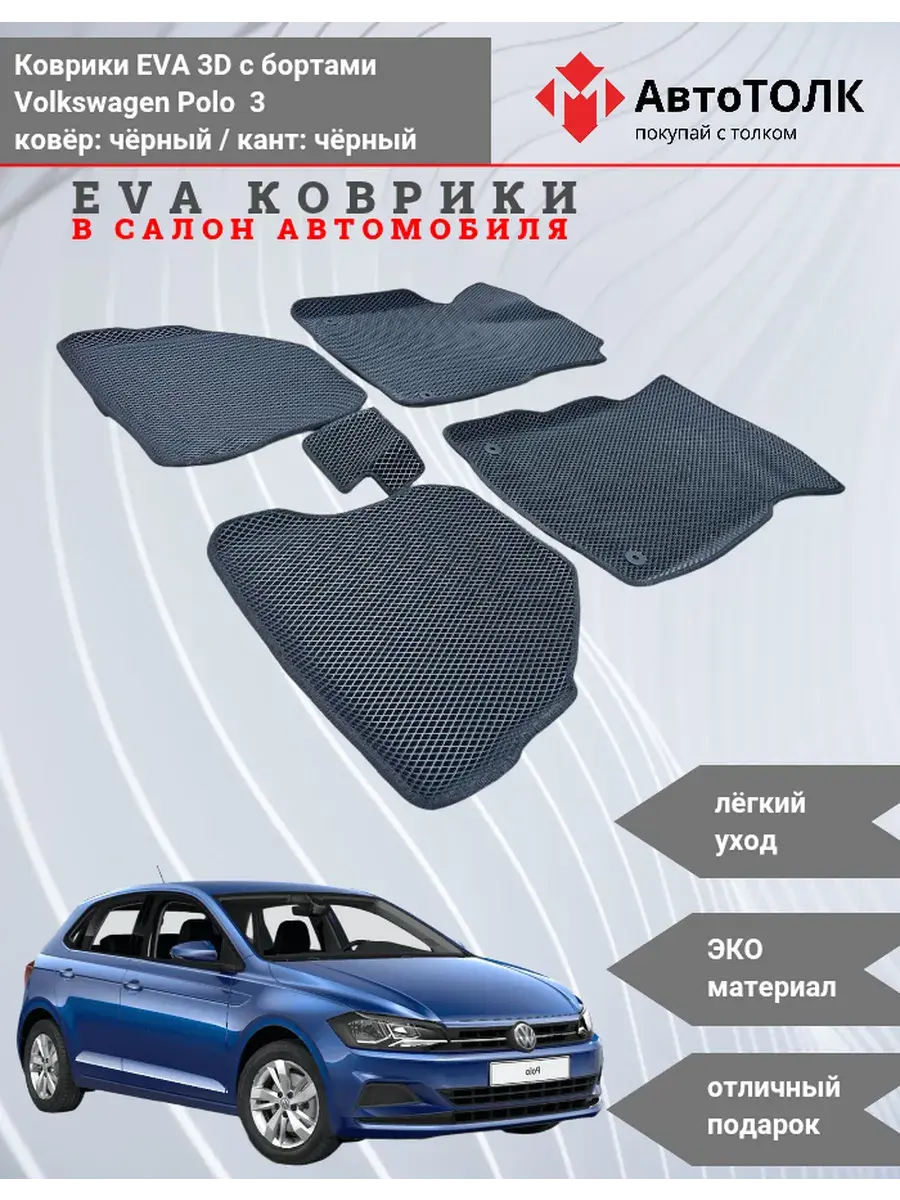 Автомобильные коврики ЕВА (EVA) 3D с бортами для Volkswagen Polo 3. Устали от грязи под ногами в вашем автомобиле и постоянных поездок на автомойку? Замените штатные резиновые коврики высокотехнологичными EVA коврами с бортами с традиционной фактурой ромб. В комплект ЭВО ковриков входит: водительский, пассажирский, 2 коврика заднего ряда и перемычка на тоннель.
