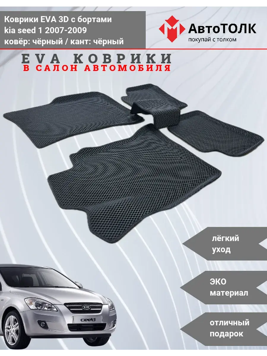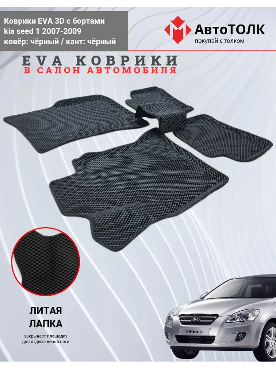 Всесезонные коврики в салон EVA 3D для KIA seed 1, с бортами. Эти коврики обладают формой в точности копирующей рельеф пола автомобиля. Данные коврики изготовлены из материала EVA. Ячеистая (ромбовидная) структура ковриков и высокий бортик не позволяют пыли, грязи, снегу, воде и другой жидкости "убежать" за пределы коврика и испачкать салон автомобиля. Уход в эксплуатации за коврами EVA 3D очень прост и ничем не отличается от ухода за резиновыми коврами. Преимущества: Коврики изготовлены индивидуально на данную модель автомобиля, повторяют все изгибы пола и максимально закрывают штатный ковролин. Все ковры имеют липучки с обратной стороны, для максимальной фиксации. На каждом комплекте устанавливаются оригинальные клипсы (при условии, если они предусмотрены заводом изготовителем) Коврики ЕВА легки в эксплуатации и создают дополнительный комфорт в салоне автомобиля благодаря ячеистой поверхности и упругости материала. ЭВА-коврики удерживают в ячейках грязь, снег и воду, и легко отмываются. Водительский коврик отформован по площадке для отдыха левой ноги и не имеет разреза, за счёт чего грязь не попадает под педальный узел.
