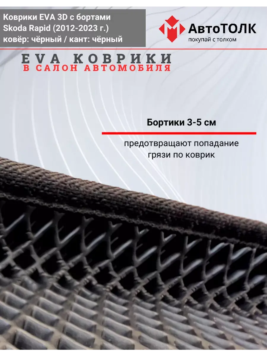 Всесезонные коврики в салон EVA 3D для SKODA Rapid 1, 2 (2013-2020), с бортами. Эти коврики обладают формой в точности копирующей рельеф пола автомобиля. Данные коврики изготовлены из материала EVA. Ячеистая (ромбовидная) структура ковриков и высокий бортик не позволяют пыли, грязи, снегу, воде и другой жидкости "убежать" за пределы коврика и испачкать салон автомобиля. Уход в эксплуатации за коврами EVA 3D очень прост и ничем не отличается от ухода за резиновыми коврами.