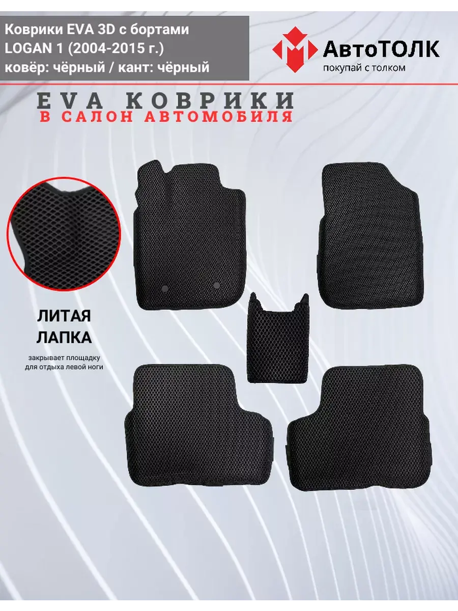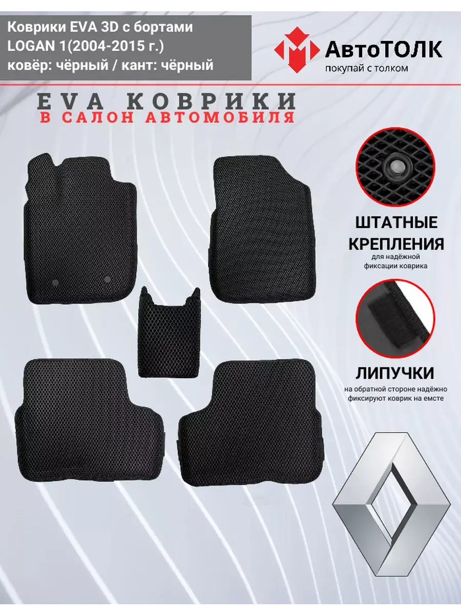 Всесезонные коврики в салон EVA 3D для Renault Logan 1 (2004-2014), с бортами. Эти коврики обладают формой в точности копирующей рельеф пола автомобиля. Данные коврики изготовлены из материала EVA. Ячеистая (ромбовидная) структура ковриков и высокий бортик не позволяют пыли, грязи, снегу, воде и другой жидкости "убежать" за пределы коврика и испачкать салон автомобиля. Уход в эксплуатации за коврами EVA 3D очень прост и ничем не отличается от ухода за резиновыми коврами.