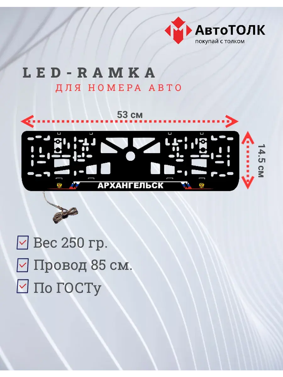 Ищете стильное и практичное обновление для вашего автомобиля? Рамка для номера с LED подсветкой надписи от бренда АвтоТОЛК — именно то, что вам нужно! Это инновационное решение не только придаст вашему автомобилю современный вид, но и повысит его заметность на дороге. Яркая ЛЭД рамка под номер обеспечивает четкое и равномерное освещение, что гарантирует отличную видимость вашего государственного номера в любое время суток и при любых погодных условиях. За счет использования высококачественных LED элементов, рамка отличается длительным сроком службы. Номерная рамка с вашим лого или логотипом торговой марки станет оригинальным дополнением, подчеркивающим индивидуальность вашего авто. Устанавливать рамки с LED подсветкой легко и удобно, они совместимы со стандартными номерными знаками и не требуют специальных навыков для монтажа. Независимо от того, выбираете ли вы рамки с ЛЭД подсветкой для себя или в подарок автолюбителю, этот автоаксессуар станет надежным и стильным приобретением. Тонкий, но прочный корпус рамки выполнен из высококачественных материалов, что обеспечивает устойчивость к механическим повреждениям, влаге и неблагоприятным погодным условиям. Обновите внешний вид своего автомобиля с применением современных технологий — номерные рамки с LED подсветкой от АвтоТОЛК это комбинация стиля, удобства и безопасности.
