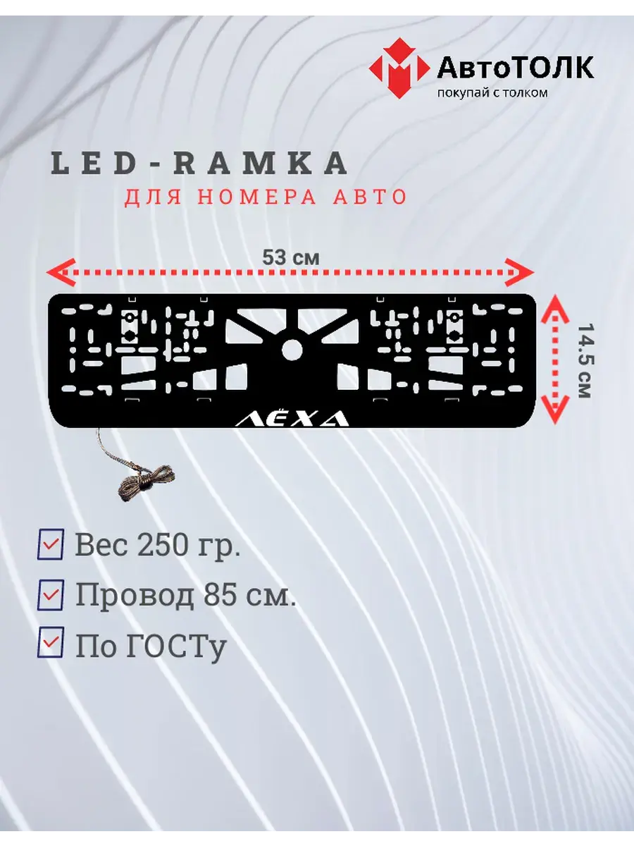 Ищете стильное и практичное обновление для вашего автомобиля? Рамка для номера с LED подсветкой надписи от бренда АвтоТОЛК — именно то, что вам нужно! Это инновационное решение не только придаст вашему автомобилю современный вид, но и повысит его заметность на дороге. Яркая ЛЭД рамка под номер обеспечивает четкое и равномерное освещение, что гарантирует отличную видимость вашего государственного номера в любое время суток и при любых погодных условиях. За счет использования высококачественных LED элементов, рамка отличается длительным сроком службы. Номерная рамка с вашим лого или логотипом торговой марки станет оригинальным дополнением, подчеркивающим индивидуальность вашего авто. Устанавливать рамки с LED подсветкой легко и удобно, они совместимы со стандартными номерными знаками и не требуют специальных навыков для монтажа. Независимо от того, выбираете ли вы рамки с ЛЭД подсветкой для себя или в подарок автолюбителю, этот автоаксессуар станет надежным и стильным приобретением. Тонкий, но прочный корпус рамки выполнен из высококачественных материалов, что обеспечивает устойчивость к механическим повреждениям, влаге и неблагоприятным погодным условиям. Обновите внешний вид своего автомобиля с применением современных технологий — номерные рамки с LED подсветкой от АвтоТОЛК это комбинация стиля, удобства и безопасности.