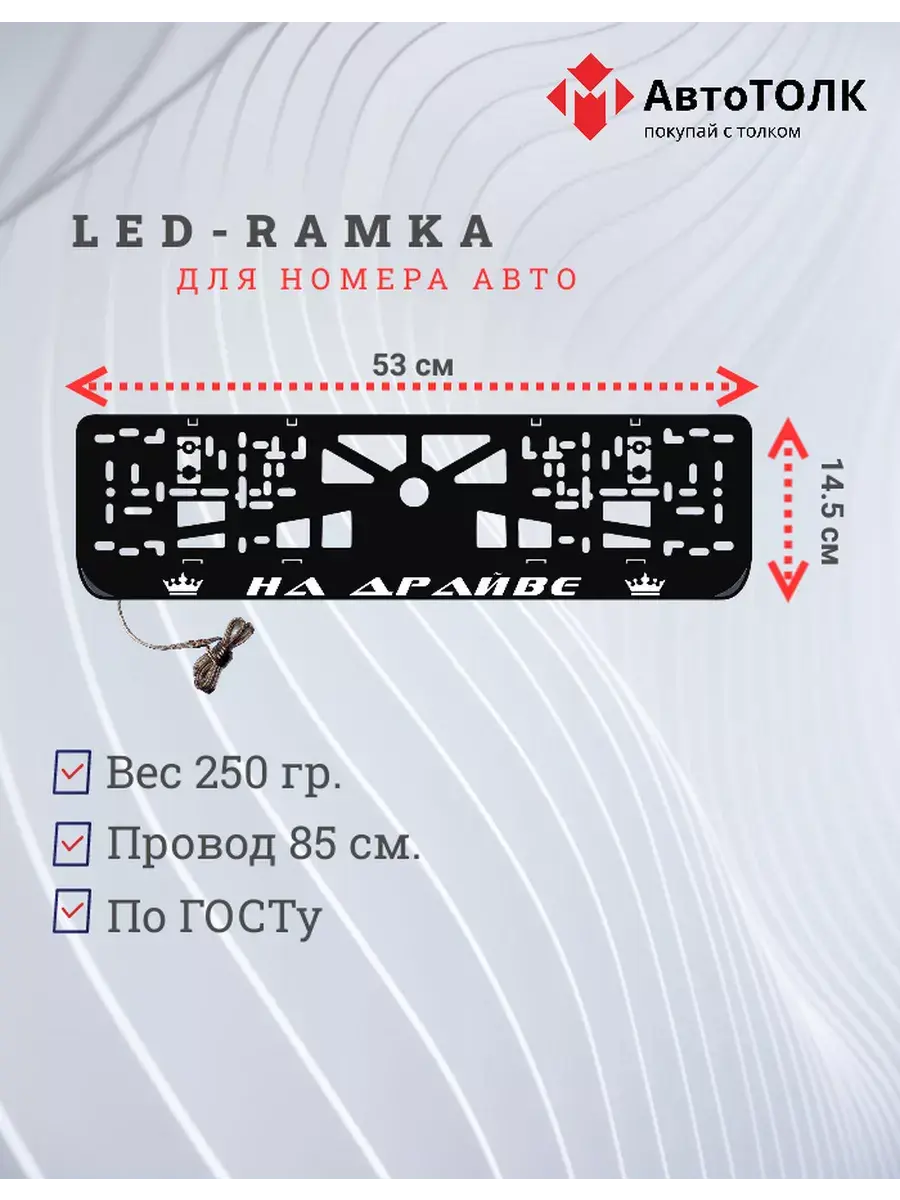 Ищете стильное и практичное обновление для вашего автомобиля? Рамка для номера с LED подсветкой надписи от бренда АвтоТОЛК именно то, что вам нужно! Это инновационное решение не только придаст вашему автомобилю современный вид, но и повысит его заметность на дороге. Яркая ЛЭД рамка под номер обеспечивает четкое и равномерное освещение, что гарантирует отличную видимость вашего государственного номера в любое время суток и при любых погодных условиях. За счет использования высококачественных LED элементов, рамка отличается длительным сроком службы. Номерная рамка с вашим лого или логотипом торговой марки станет оригинальным дополнением, подчеркивающим индивидуальность вашего авто. Устанавливать рамки с LED подсветкой легко и удобно, они совместимы со стандартными номерными знаками и не требуют специальных навыков для монтажа. Независимо от того, выбираете ли вы рамки с ЛЭД подсветкой для себя или в подарок автолюбителю, этот автоаксессуар станет надежным и стильным приобретением. Тонкий, но прочный корпус рамки выполнен из высококачественных материалов, что обеспечивает устойчивость к механическим повреждениям, влаге и неблагоприятным погодным условиям. Обновите внешний вид своего автомобиля с применением современных технологий номерные рамки с LED подсветкой от АвтоТОЛК это комбинация стиля, удобства и безопасности.
