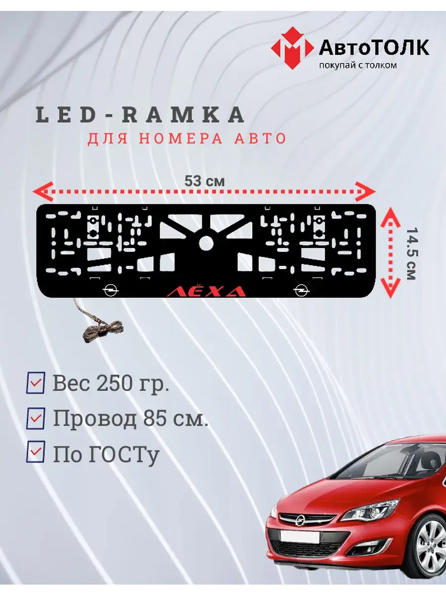 Ищете стильное и практичное обновление для вашего автомобиля? Рамка для номера с LED подсветкой надписи от бренда АвтоТОЛК — именно то, что вам нужно! Это инновационное решение не только придаст вашему автомобилю современный вид, но и повысит его заметность на дороге. Яркая ЛЭД рамка под номер обеспечивает четкое и равномерное освещение, что гарантирует отличную видимость вашего государственного номера в любое время суток и при любых погодных условиях. За счет использования высококачественных LED элементов, рамка отличается длительным сроком службы. Номерная рамка с вашим лого или логотипом торговой марки станет оригинальным дополнением, подчеркивающим индивидуальность вашего авто. Устанавливать рамки с LED подсветкой легко и удобно, они совместимы со стандартными номерными знаками и не требуют специальных навыков для монтажа. Независимо от того, выбираете ли вы рамки с ЛЭД подсветкой для себя или в подарок автолюбителю, этот автоаксессуар станет надежным и стильным приобретением. Тонкий, но прочный корпус рамки выполнен из высококачественных материалов, что обеспечивает устойчивость к механическим повреждениям, влаге и неблагоприятным погодным условиям. Обновите внешний вид своего автомобиля с применением современных технологий — номерные рамки с LED подсветкой от АвтоТОЛК это комбинация стиля, удобства и безопасности.